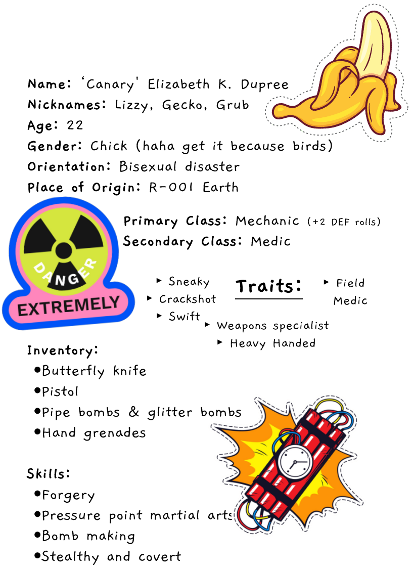Canary is, at her core, the definition of 'youthful.'She's a helping hand, a shoulder to cry on, a voice of reason and encouragement. Sometimes she gets a little carried away- overzealous and always at 110% when it comes to things, but her heart is always in the right place! Even if her head sometimes isn't- she does get a little jumbled up in the thick of things here and there.Now and then she can't help being a little rebellious, but for the most part, she's very respectful of her peers and elders! Just don't cross her, or her loved ones.