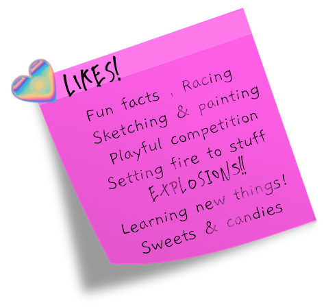 Writes a little series of stories based on her family called 'The Terrifying Trio'. She even draws little illustrations for it too! The characters are anthropomorphic animals.